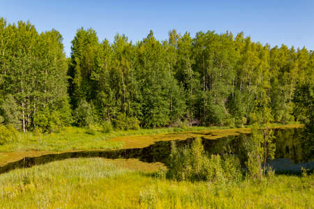 Northern natural landscape in the summer. Calm slow river on a hot sunny day
