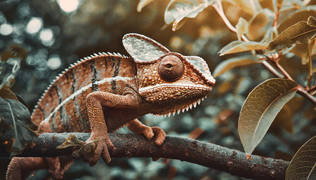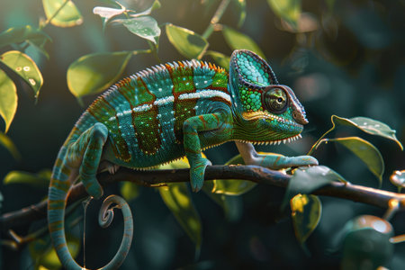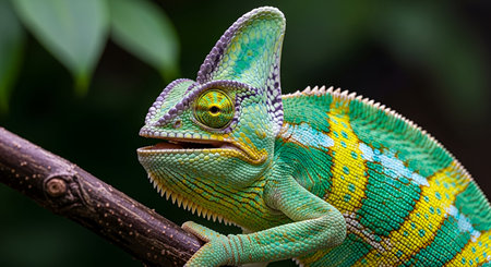 Colorful Chameleon Blending in with Green Leaves on Branch in Natural Habitat