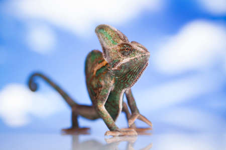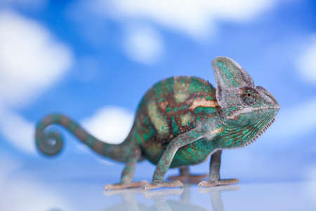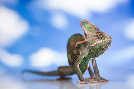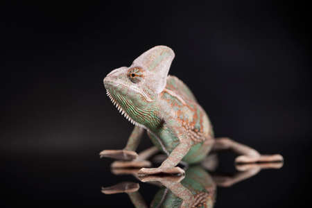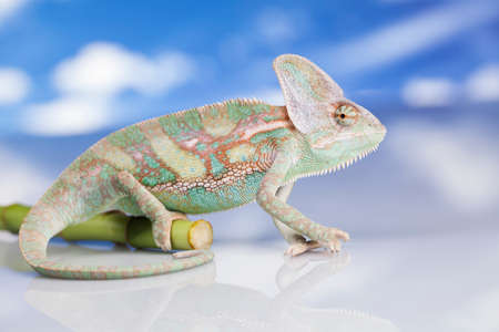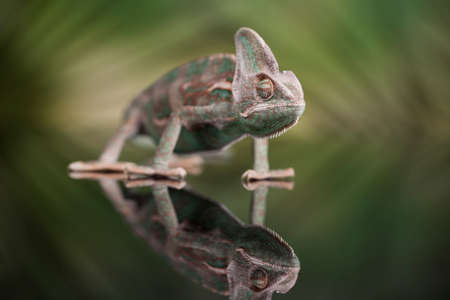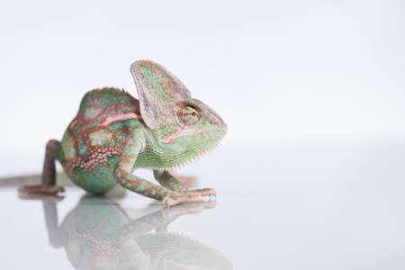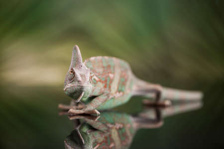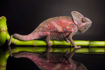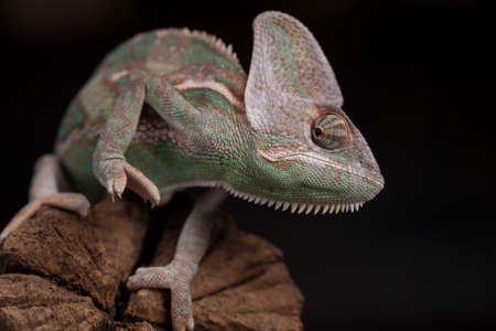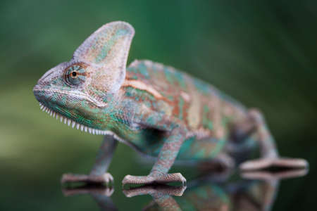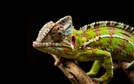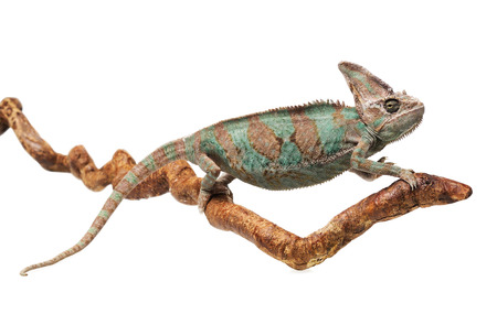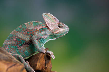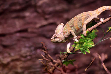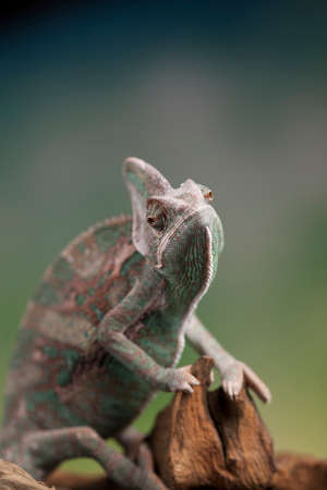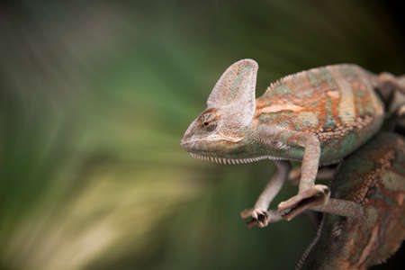 Colorful chameleon on a tree branch, Chamaeleo calyptratus.