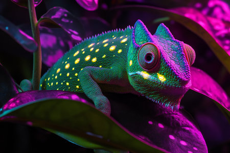 A neon green lizard with glowing spots, blending into a neon jungle background, created by ai