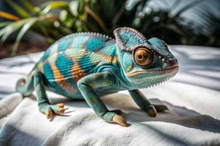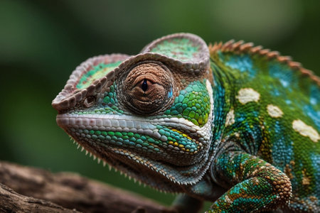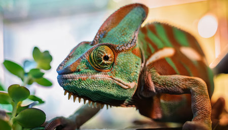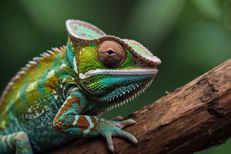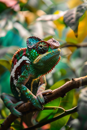 Close-up of a colorful chameleon perched on a small branch. The lizards skin shows brilliant patterns with shades of green, blue, and red. Focus highlights its unique eye structure.