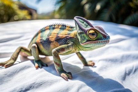 A colorful chameleon sits on a green plant, basking in warm sunlight and showing its hues.