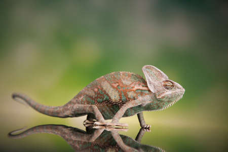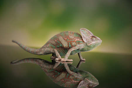 Veiled chameleon (chamaeleo calyptratus) in forest on nature background.