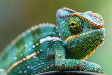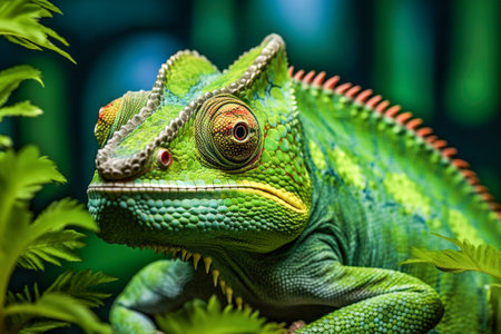 Green chameleon with textured skin close-up, blurred tropical background. Multi-colored skin of a chameleon in nature. Generative AI.
