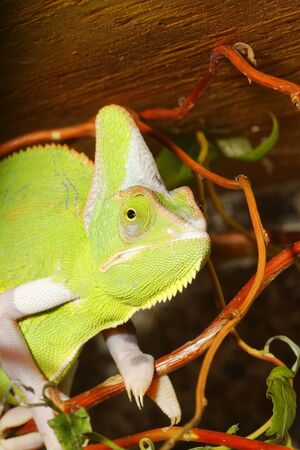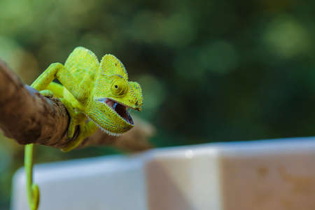Green chameleon on a branch. Domestic pet exotic tropical animal.