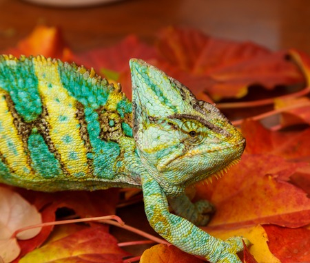 Chameleon red and orange in the close-up of terrarium reptile lizard