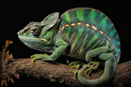 Chameleon showing veiled chameleon on a branch. High resolution image suitable for commercial use. Clear details and vibrant colors enhance visual appeal.
