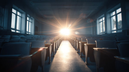 Warm light floods into a vacant classroom, illuminating rows of seats and creating a calm and peaceful atmosphere during the afternoon.