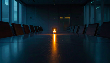 In the deep silence of a deserted boardroom, a single candle burns, its flame casting a warm, hopeful glow across the polished table.