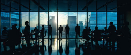 Back lit photo of business people in conference room standing sitting window city. Generative AI AIG19.