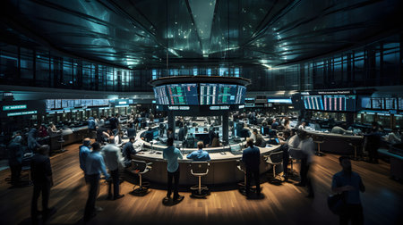 Inside a bustling stock exchange with traders active at work during a busy trading session in the late afternoon