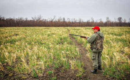 Hunter moving with shotgun looking for prey. Hunter with a gun. Hunting for hare