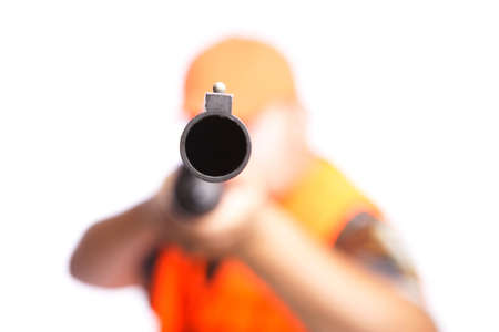 Hunter holding a shotgun pointed at the camera with focus on the nozzle, isolated on white
