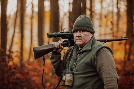 Autumn hunting season. Hunter with shotgun gun on hunt. Autunm hunting. Poacher with Rifle Spotting Some Deers. Close up Portrait of hamdsome Hunter.