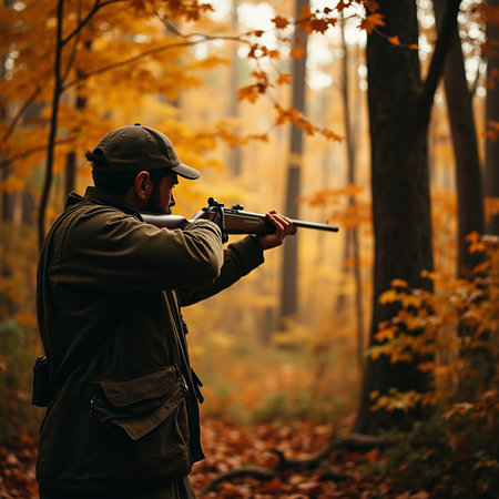 A man holds a rifle in the woods, engaging in outdoor hunting and shooting activities, Hunter aiming with rifle, AI Generated