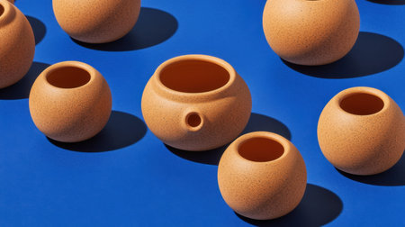 A captivating arrangement of terracotta pots in various sizes on a vibrant blue background. This image showcases modern design and aesthetic beauty.