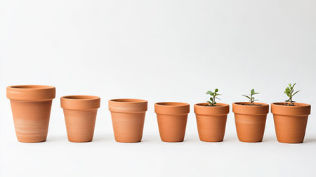 A sequence of terracotta pots showcasing various growth stages of plants, illustrating the journey from empty containers to small thriving sprouts, perfect for gardening themes.