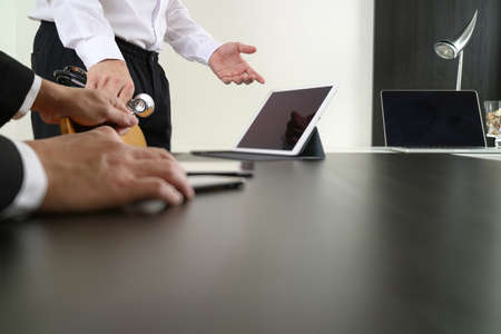 Medical co working concept,Doctor working with smart phone and digital tablet and laptop computer to meeting his team in modern office at hospital
