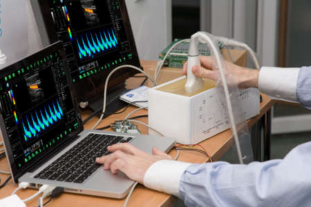 Medical technology concept. Doctor hand working with modern digital tablet and laptop computer and smart phone with medical chart interface. On marble desk, Sun flare effect photo