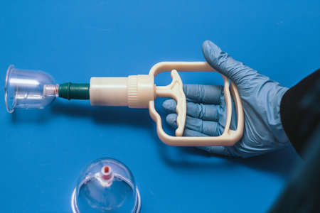 Close up woman hand in a rubber gloves put sample in a glass vial with blue cap into the autosampler rack in HPLC system. High performance liquid chromatography for separation compounds . Scientific and research work at chemical or clinical laboratory