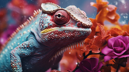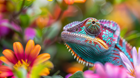 A chameleon blending into colorful flowers, curiously peering out with its rotating eyes
