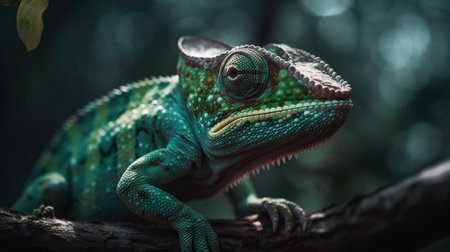 Witness a chameleon's seamless camouflage in a luminous forest, a visual poem of creativity and change This captivating scene showcases nature's artistry, emphasizing adaptation Explore vibrant colors and intricate details of this unique creature within its enchanting, mysterious habitat, a true testament to nature's transformative power AI Generative