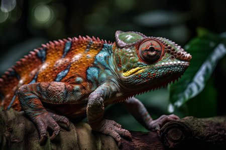 Colorful chameleon in jungle background, close-up focus on vibrant skin texture.