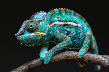 Vibrant chameleon perches on a branch, displaying its striking colors and intricate patterns