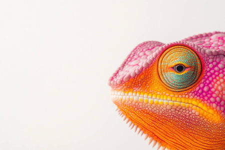 Close up of a vibrant chameleon showcasing vivid colors and intricate patterns against a soft white background, highlighting its beauty and unique features