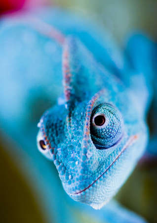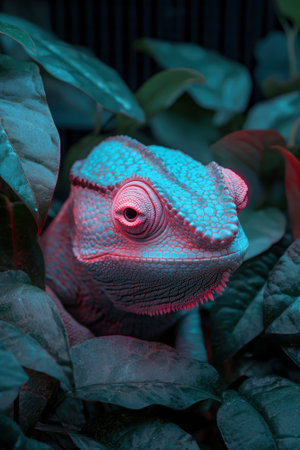 Colorful chameleon in neon light. Close up of chameleon.