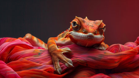 A colorful chameleon resting on vibrant red fabric, showcasing its detailed texture and striking appearance.