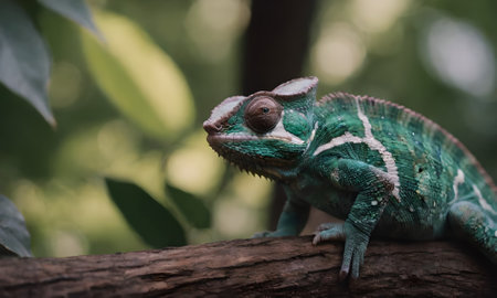 Witness the captivating beauty of nature in this close-up shot of a vibrant chameleon perched on a branch, its penetrating gaze inviting you into its enigmatic world. The lizard's kaleidoscopic skin showcases an array of hues, blending seamlessly with the surrounding foliage. Prepare to be mesmerized by the chameleon's watchful eye as it surveys its surroundings with an air of regal curiosity.