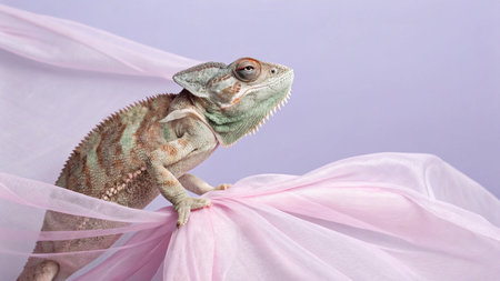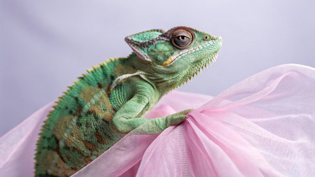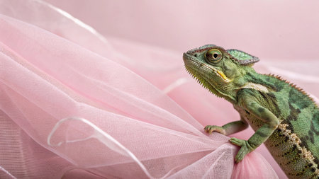 Green chameleon on pink tulle background, close-up