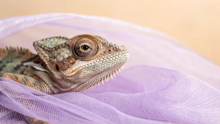 chameleon on a purple cloth, close-up, macro