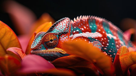 A chameleon blending into colorful flowers, curiously peering out with its rotating eyes