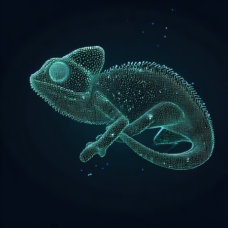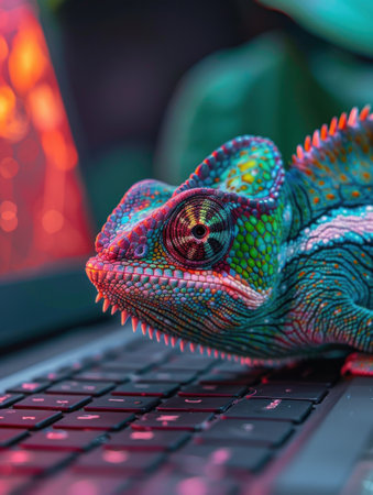 Camouflaged chameleon on a secure laptop, dusk lighting, closeup, crypto safety , close-up