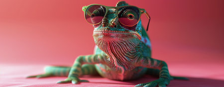 Chameleon in sunglasses on green background for eyecatching corporate marketing banner. Concept Chameleon, Sunglasses, Green Background, Corporate Marketing, Eyecatching Banner