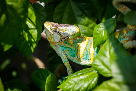 Colorful chameleon on a tree branch, Chamaeleo calyptratus.
