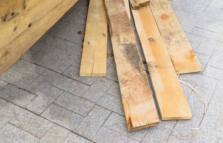 Close-up view of stacked, aged wooden planks on a workbench, with visible sawdust scattered around them. Tools are partially visible in the background.