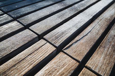 20251228 showing close up of weathered wooden planks on a deck showing cracks grain and mossy texture with a shallow...
