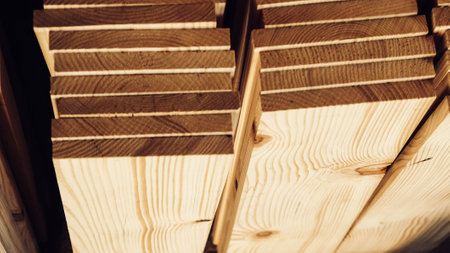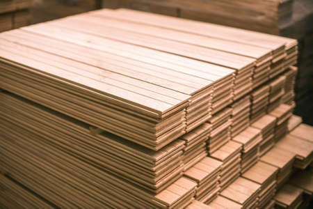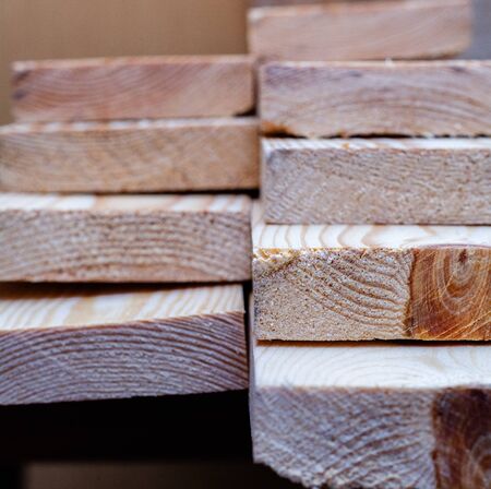 Stacked wooden carpentry boards from natural wood in a woodworking industry.