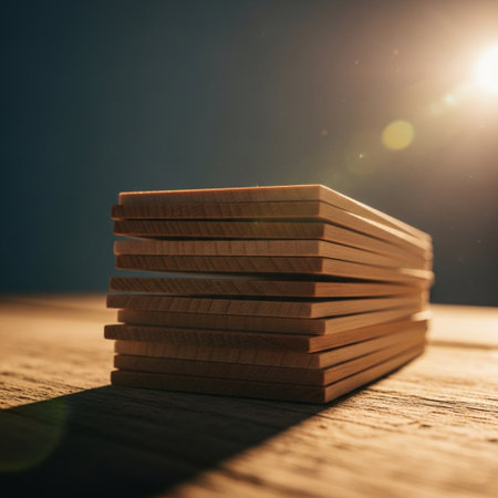 A visually striking arrangement of wooden blocks stacked vertically against a dark background. A ruler leans against the blocks, showcasing measurement tools for crafting and woodworking projects.
