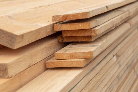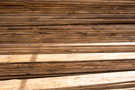 Piles of wooden planks at a sawmill, formwork. Warehouse for sawing boards at an outdoor sawmill. Plank texture.