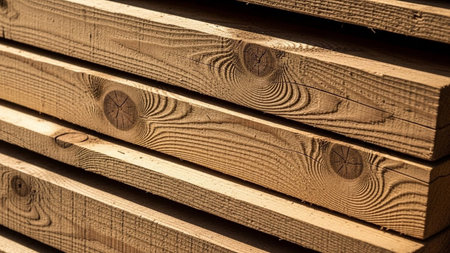 A close-up of stacked rough wooden planks displaying prominent grain patterns and knots, illuminated by natural...