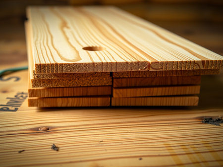 Stack of wooden planks lying on surface, showing smooth texture and clean edges, freshly cut lumber arranged in pile, highlighting natural wood grain and construction material