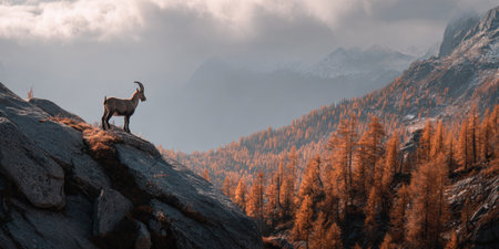A majestic alpine ibex navigates the rocky terrain of a mountainous landscape, showcasing its natural agility and strength in a stunning wilderness setting.