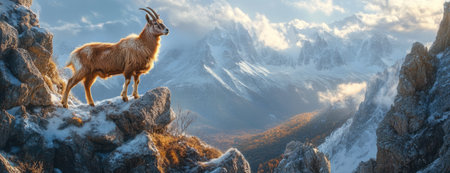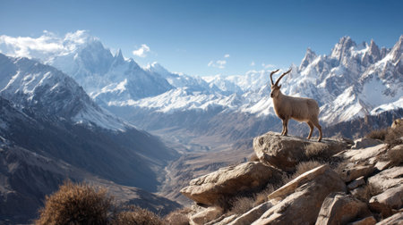 Magnificent mountain goat, with prominent horns, stands on a rocky outcrop against a backdrop of snowy, high mountains. The image captures the animal's presence in its natural habitat, showcasing the beauty of alpine scenery.