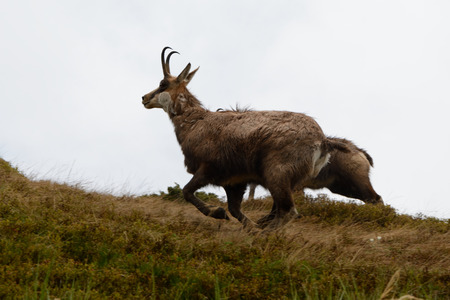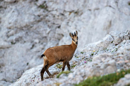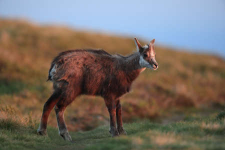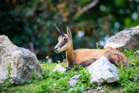 Chamois, Rupicapra rupicapra. Agile goat-antelope found in mountains of Europe. Wildlife nature at Chopok, Low Tatras, Slovakia. Shiny weather during summer day.