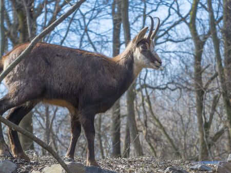 A chamois standing on rocks in the Austrian Alps, sunny day in early springtime