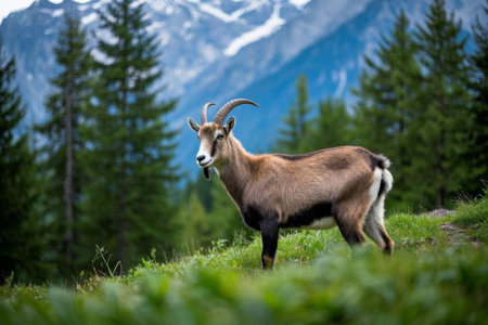 Wild alpine young goat portraiture, green mountain nature on the background.